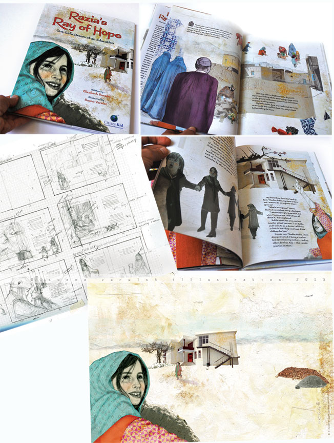 SV: I combined photographic and drawn elements to create a contrast or an emphasis to interpret the text. The photo-collages of the buildings that appear throughout the book allude to little Razia’s dream of an education and the eventual building of the school. The dove symbolizes the yearning for peace. The hinges pointing at the burka-clad women illustrate the tension and violence towards women. The pink blossoms speak of renewal and hope. In contrast to the very real feeling of the photographic elements the pencil drawings are softer in nature, the bright colours and textures speak of traditions, customs and hope. Finally, the paper elements and collages that appear as backgrounds refer to Razia’s secret reading and writing efforts.